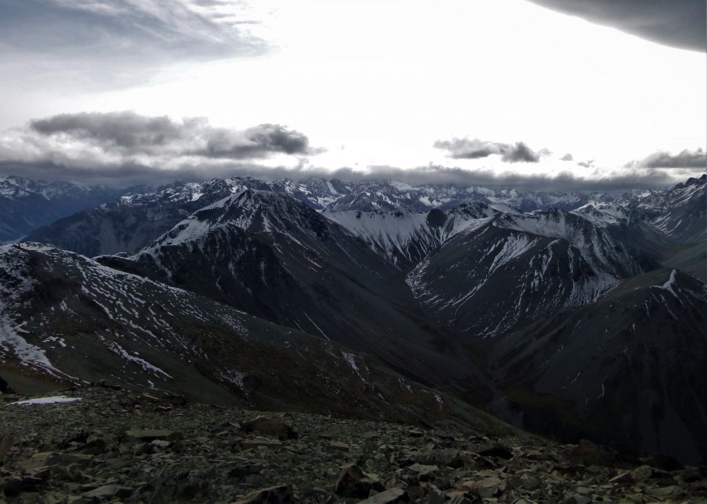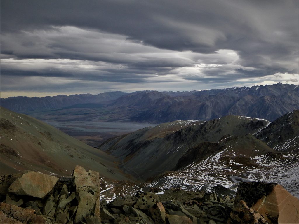 After a night’s stay at the crib in Lake Clearwater I was up early-ish to see a grim grey sky, and I knew rain was going to pay the area a visit later on in the day. It is only a 15 minute drive from Lake Clearwater to the start of the track up to Erewhon Park. It was eerily calm, with big black storm clouds looming on the horizon as I got my gear out of the car and began to hike. The easy gradient of the road makes for an easy walk in, and at times the gradual climb on a zigzagging track is barely noticed. The ski area resides in a large hanging valley with several large basins perfect for holding snow during the winter months. Once in the hanging valley the road is straight forward, and about halfway between the valley’s entrance and the upper basins is a large washout. The slip is a result of continuous avalanches, and has completely destroyed the road. Every time I visit the area the slip has changed, and sometimes crossing over is a risky affair. On this mission it wasn’t too bad, and after carefully negotiating the big slip on the road I continued on to the ski area. The goal for this visit to the area was one of the big peaks at the head of the valley, Erewhon Peak(2068m). To get to the base of the south ridge I followed the bulldozed track into the snow of the upper basin, which was starting to get whipped up by the building Nor’West wind. A short, steep, and sometimes exposed scramble on the loose red rock of the south ridge led me to the summit, and now in the full force of the wind. The powerful wind took my breath away, and cut through the many layers of clothing I was wearing. With the wind burning the tiny amount of skin I had exposed I knew this wasn’t a place to linger.
