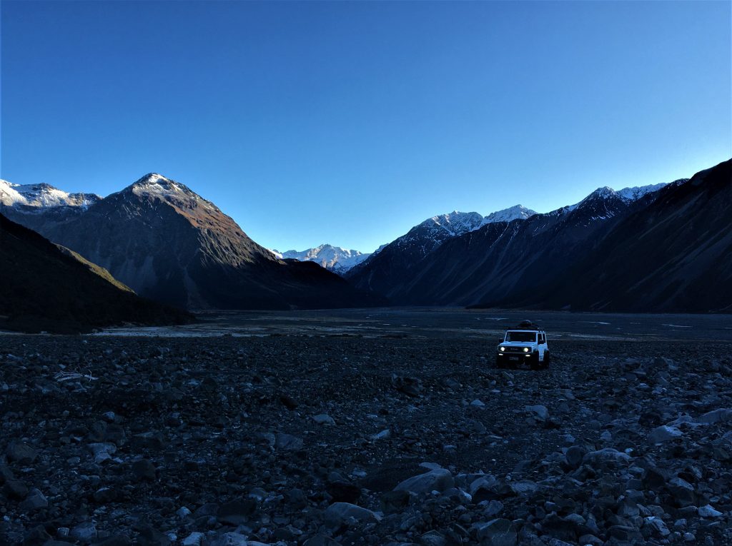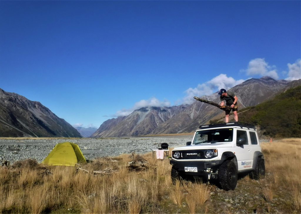 By morning the cloud had cleared, and we were treated to a beautiful sunrise, as we cooked up an epic feed for breakfast at our frosty campsite. We could now see up the Havelock Valley, and looking at the map we decided to go further and see how close we could get to Mistake Flats at the junction of the Forbes and Havelock Rivers. We traveled 6km, over four hours and many, many times, especially at Carneys Creek, we were forced to turn back to find another way through the jumbled maze of riverbed rocks. The area was hit by a huge storm with a good dosage of heavy rain a few months before, and a lot of the track in the upper valley had been washed out. At time we had to stop and manuelly make our own track by moving the bigger rocks, and we slowly picked our way through until we got to a stunning waterfall and another very inviting terrace. We went up to inspect the terrace and as we drove through the long tussock, suddenly the truck was wedged up on a rock. At times, as Adam tried to get off the rock, the truck was on three wheels and just as we were starting to think what’s plan B, he somehow wrestled the Jimny free and we felt we should leave this spot and look for another place. The spot we finally agreed on was well worth the extra effort with epic views everywhere, including Mt McMillan(1883m) standing guard over Mistake Flat , only a couple of kilometres away. To make sure we had a quality fire to match the grand area, we put the Jimny to work and gathered large pieces of wood on the roof and transported it back to our campsite. And yes, the fire was grand! The stars were on show, and the display of the Milky Way made for some incredible photography of our temporary home in The Havelock. We were up in the frost early-ish the next morning, shaking off the ice and packing up, knowing we had to somehow get back across the maze at Carneys Creek. We got to within 20m of easy ground, when we were stopped by a wall of rocks and had to turn back and retrace our ‘track’ for a good 45 minutes, before picking a completely different place to get through. After negotiating Carneys Creek, we knew the rest of the way was pretty straight followed and we stopped for a brew at Camp Creek, just in time to see a couple of Microlight Aircraft take off from the small airstrip at Growler Hut into the bluebird sky. As we made our way out we passed heaps of other trucks in the Rangitata, and each truck we stopped to have a chat with asked the same exact question “Did ya shot anything”…seriously, the exact same question from each truck!
