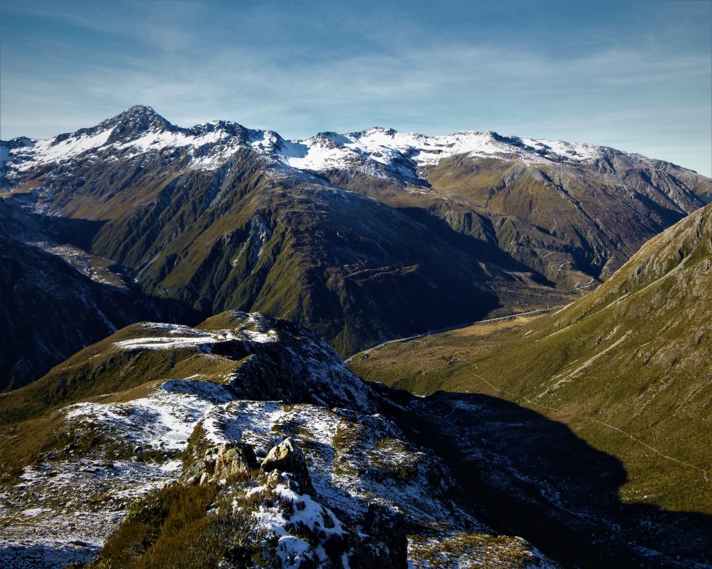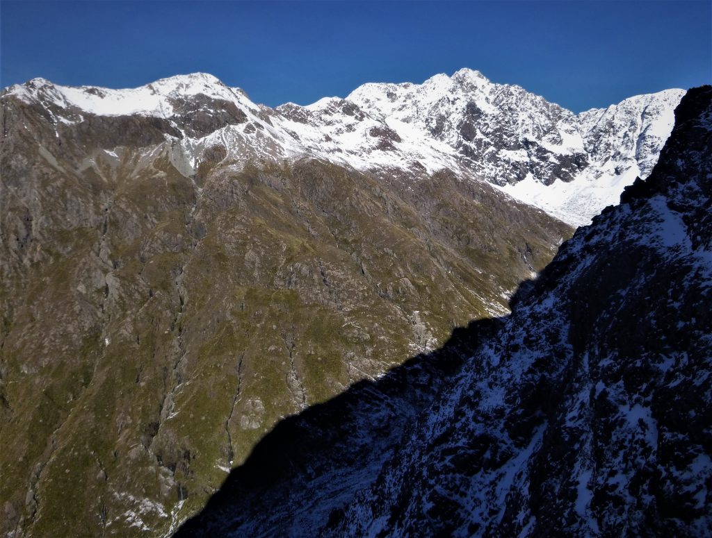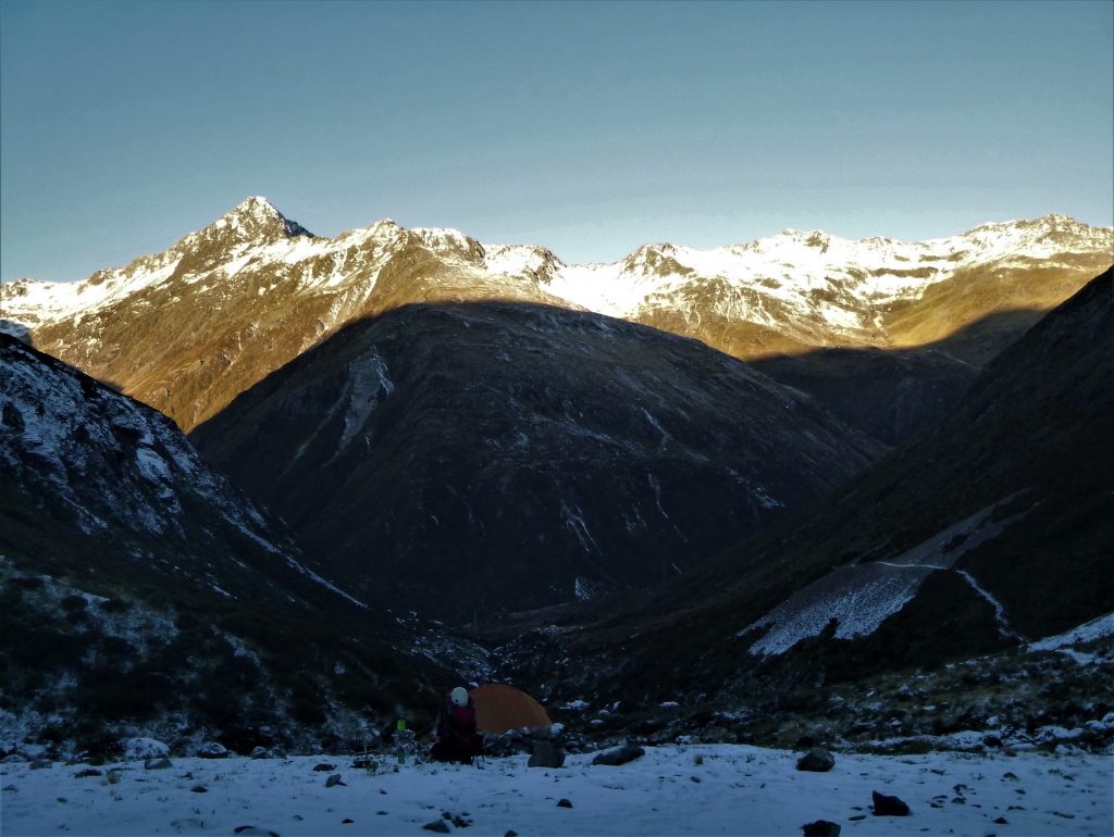 An early-ish start in the dark from my very cold camp had me zigzagging in my crampons up past Warnocks Knob(1167m) and towards the snow covered Philistine Bluffs. I have read about the avalanche danger on the bluffs after snowfall and after only 30 minutes or so of climbing up through the bluffs I saw an avalanche pour down a gully about 20 meters away from me. It didn’t take me long to decide to turn around and as I did another load of snow and rock smashed its way down the same gully and for the rest of the down climb I didn’t look up. I got back onto safe ground and stopped for a drink and a snack and just as I did the sound of a huge avalanche from some where near the top of Mt Rolleston echoed throughout the valley. The place was alive and as I quickly packed up my tent I had a feeling that humans didn’t belong in the Upper Otira Valley at that point in time. I wandered back down the track quickly, happy to be out of the valley and safely back at my car.