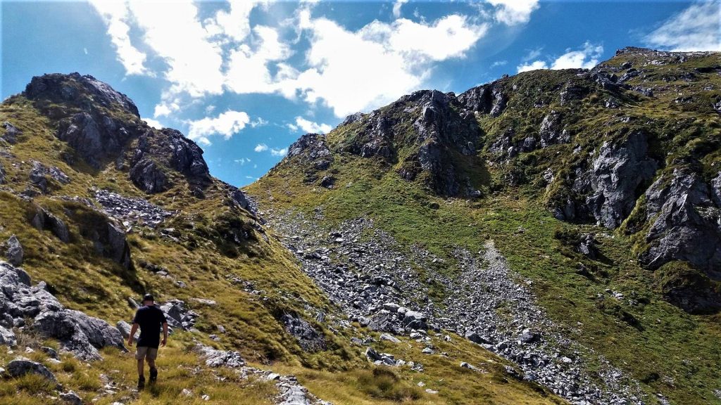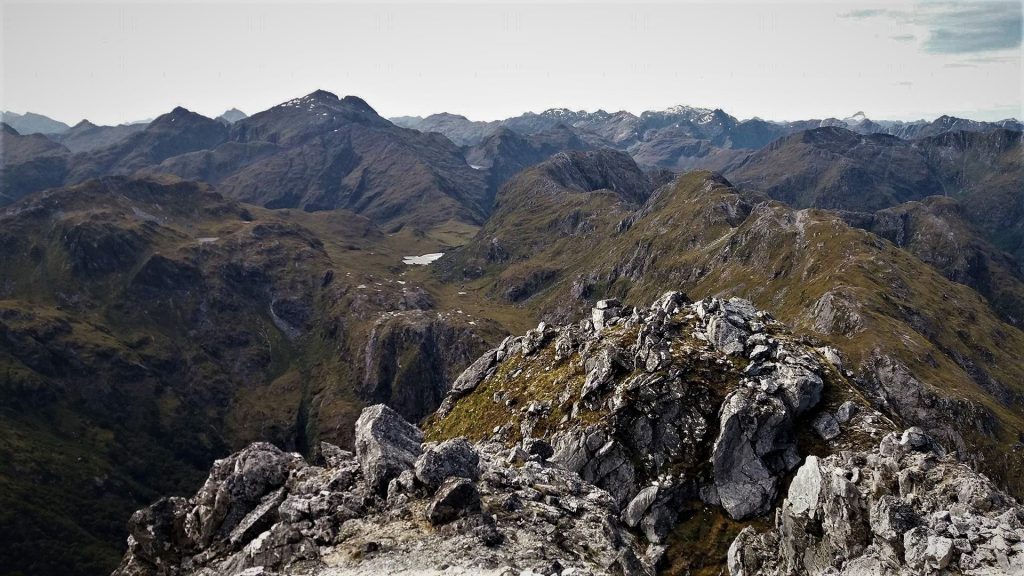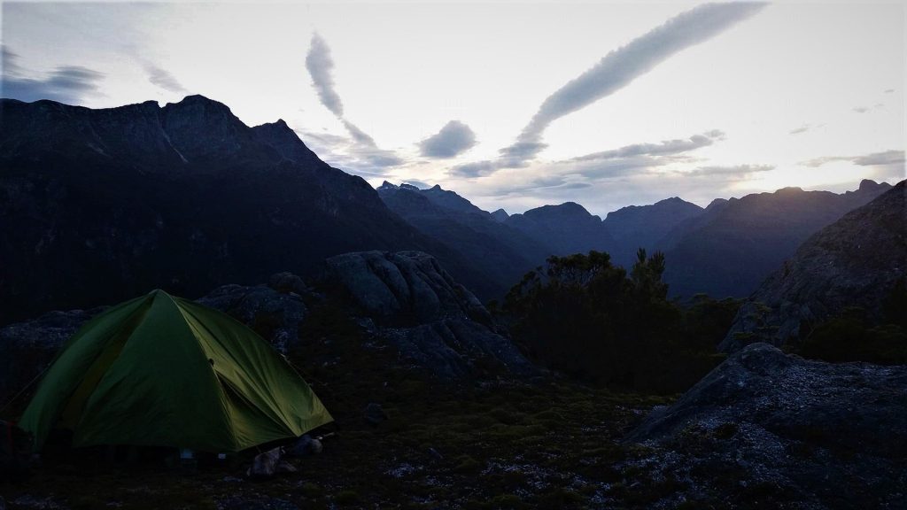 I decided to include a night camping on the peak when I headed there late in 2017, and along with the camping gear I needed to carry extra water for drinking and cooking. It is safe to assume that our packs were a little bit heavier than daypacks, but enthusiasm and excitement always helps with the first few steps when wearing a pack that is over half your own body weight. The route begins behind the West Arm Power Station, and at first was very easy as it passed through a small cave. After the cave we came across an old water pipe, which helped with navigating the thick bush for a couple hundred meters. Above this we followed animal tracks at first, then it was some good old fashioned bush-bashing. Having full packs made some of the steep scrambling interesting, as the pack would get caught up in the tree, and this would always happen in the worst situations. At one stage the only way up was through a bush covered rock bluff. In places, to get past the foliage, I had to lean back to dislodge branches with a very large drop below me. After what seemed like days of bush-bashing we finally got above the worst of the bush and onto the shoulder of the mountain. This was the best place for camp, but with the forecasted rain the next day, we only had time to stash the heavy gear and head for the summit. A steep gut led to the south west ridge, which provided a fun scramble to the top of Leaning Peak(1477m). As expected the mountain’s location made for incredible views in all directions, including the distant snowy summits of Mt Earnslaw and Mt Aspiring. The lake where we started was now 1200 meters below, and this gave an amazing sense of achievement, and with one last look around it was time to head down to the campsite on the mountain’s shoulder. After getting ‘slightly’ lost in the bush descending, we finally found camp, and after putting the tent up it was obvious this was gonna be a campsite to remember.